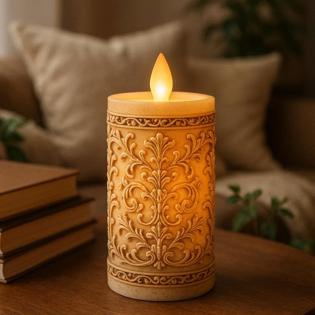 Ornate candle holder with aged brass detailing, blending traditional charm with modern LED technology.